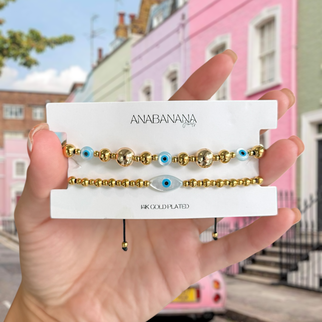 Add a touch of golden charm to your everyday style with our Golden Gaze Duo Bracelet Set by ANABANANA Jewelry.