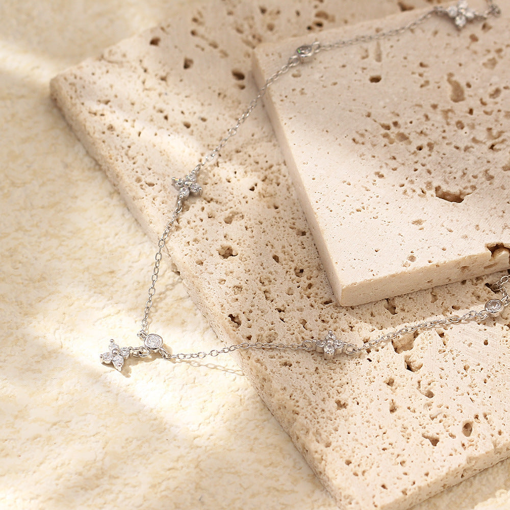 • Design: Features ~6mm pave CZ diamond flower charms and ~4mm round CZ diamond accents on a dainty cable chain, adjustable from 16 to 18 inches